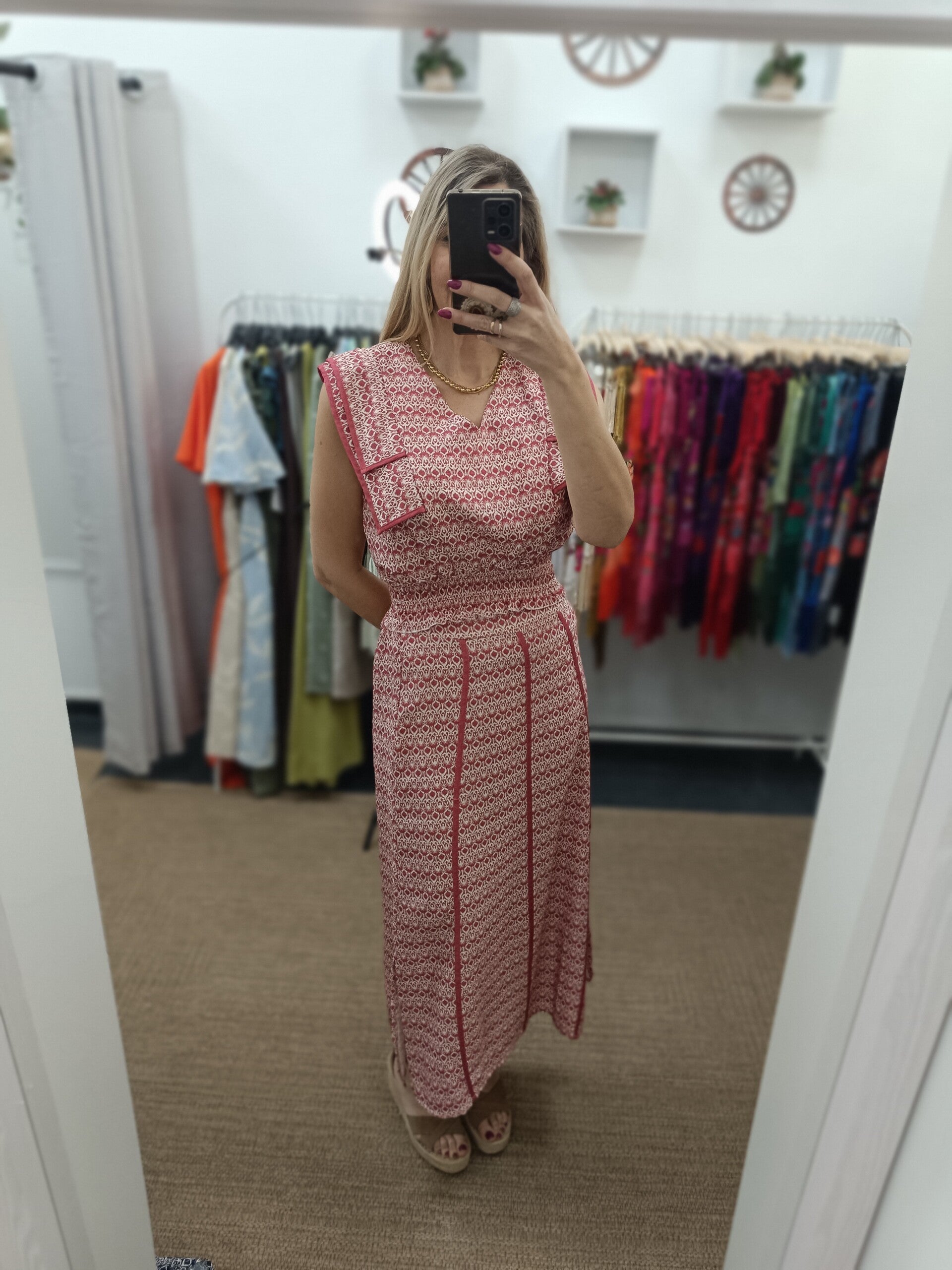 Top forma diamante con cuello de pico y goma cintura y falda con elastico detras en cinturilla y tres rayas verticales en parte delantera.