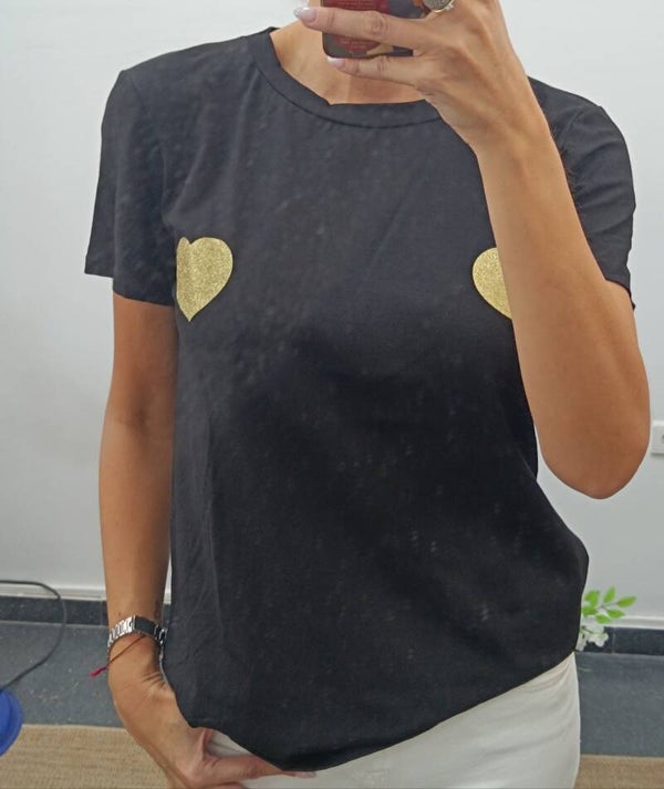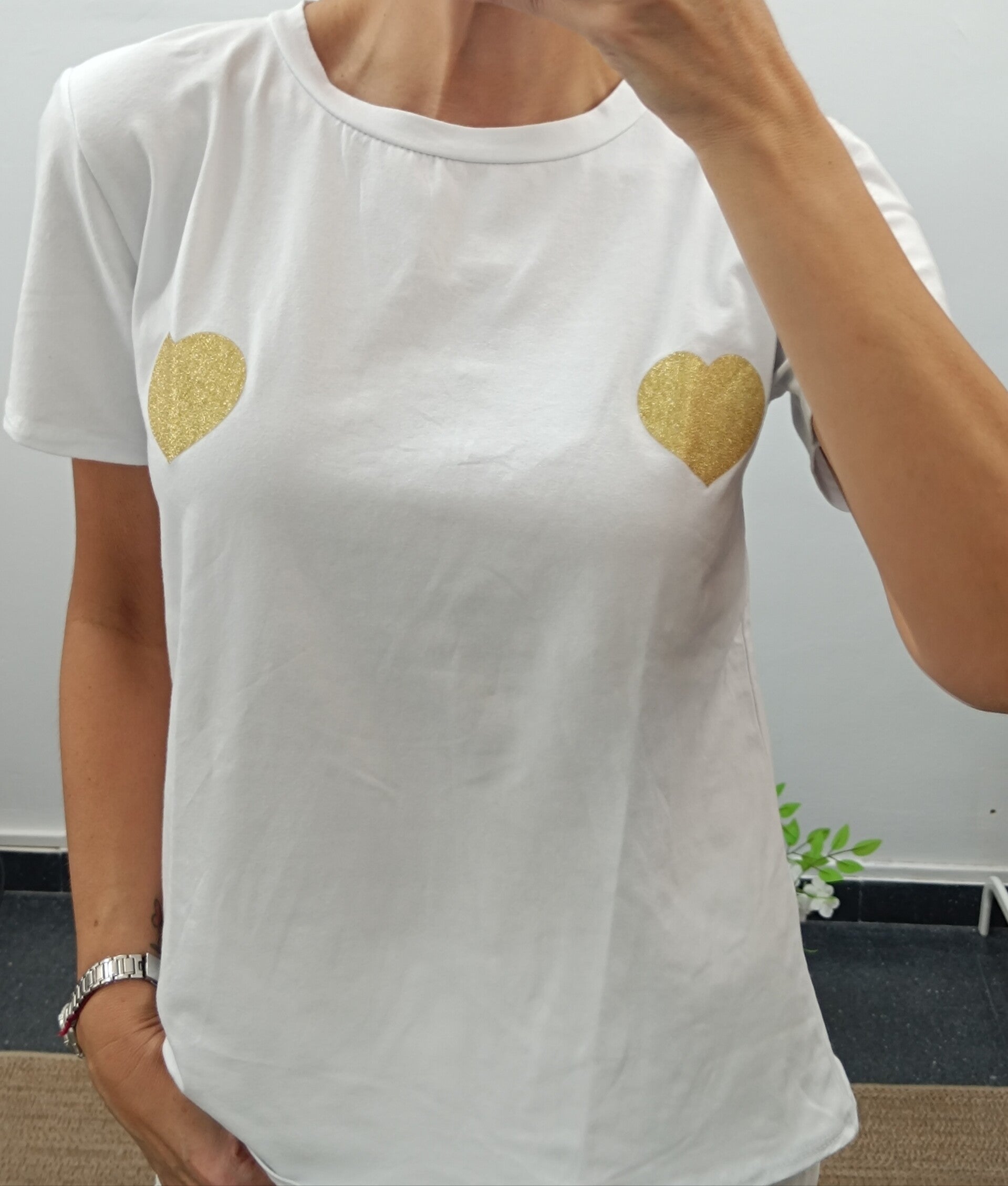 CON ADORNO DE CORAZONES DORADOS.