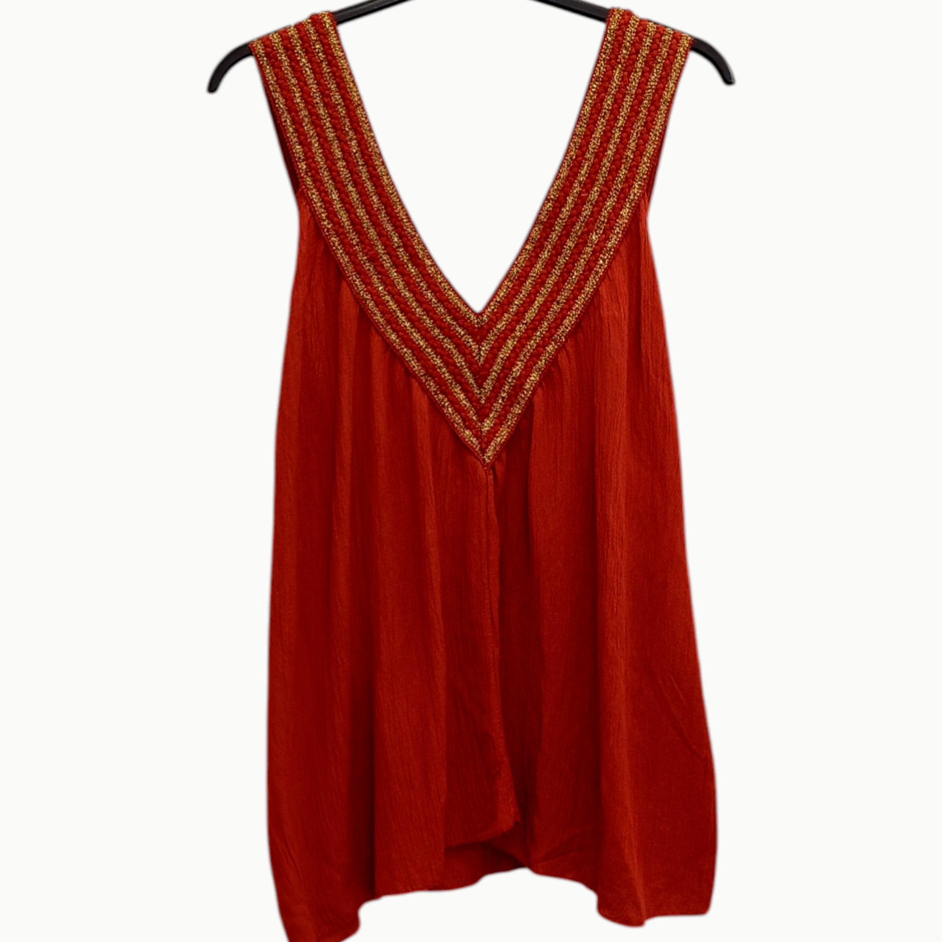 TOP EN TELA TIPO BAMBULA, CON CUELLO DE PICO ADORNADO CON HILOS DORADOS.